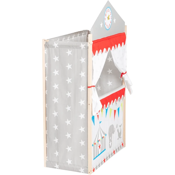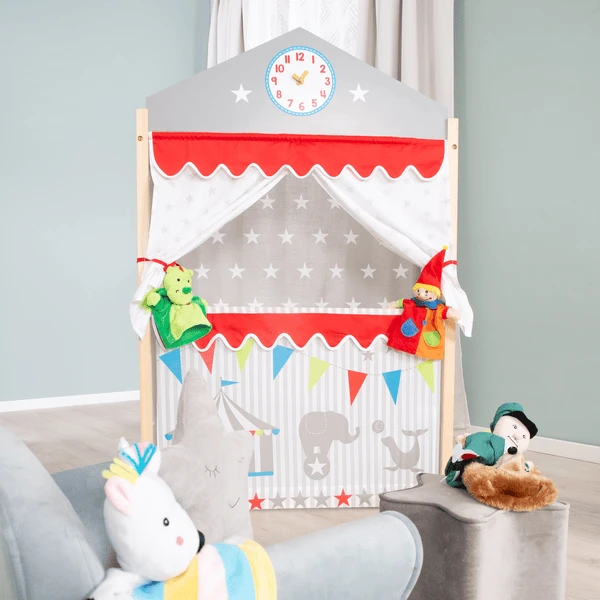 - Uitgerust met gordijnen en een klok met beweegbare wijzers zorgt de Punch and Judy show voor veel plezier en “stipte” voorstellingen in de kinderkamer.