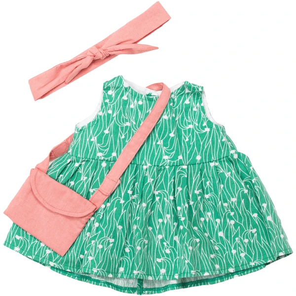 - De set bestaat uit een groen gebloemde jurk, een roze haarband met klittenbandsluiting en een roze handtas.